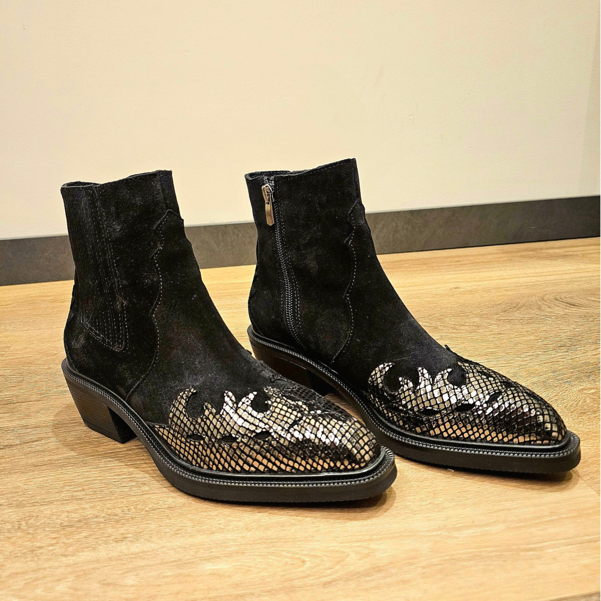 De combinatie van zwart suède met het subtiele patroon geeft deze laarsjes een unieke, stoere uitstraling.